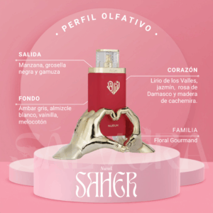 Notas de fondo: jazmín, almizcle, notas amaderadas y madera de oud, proporcionando una base cálida y sensual.