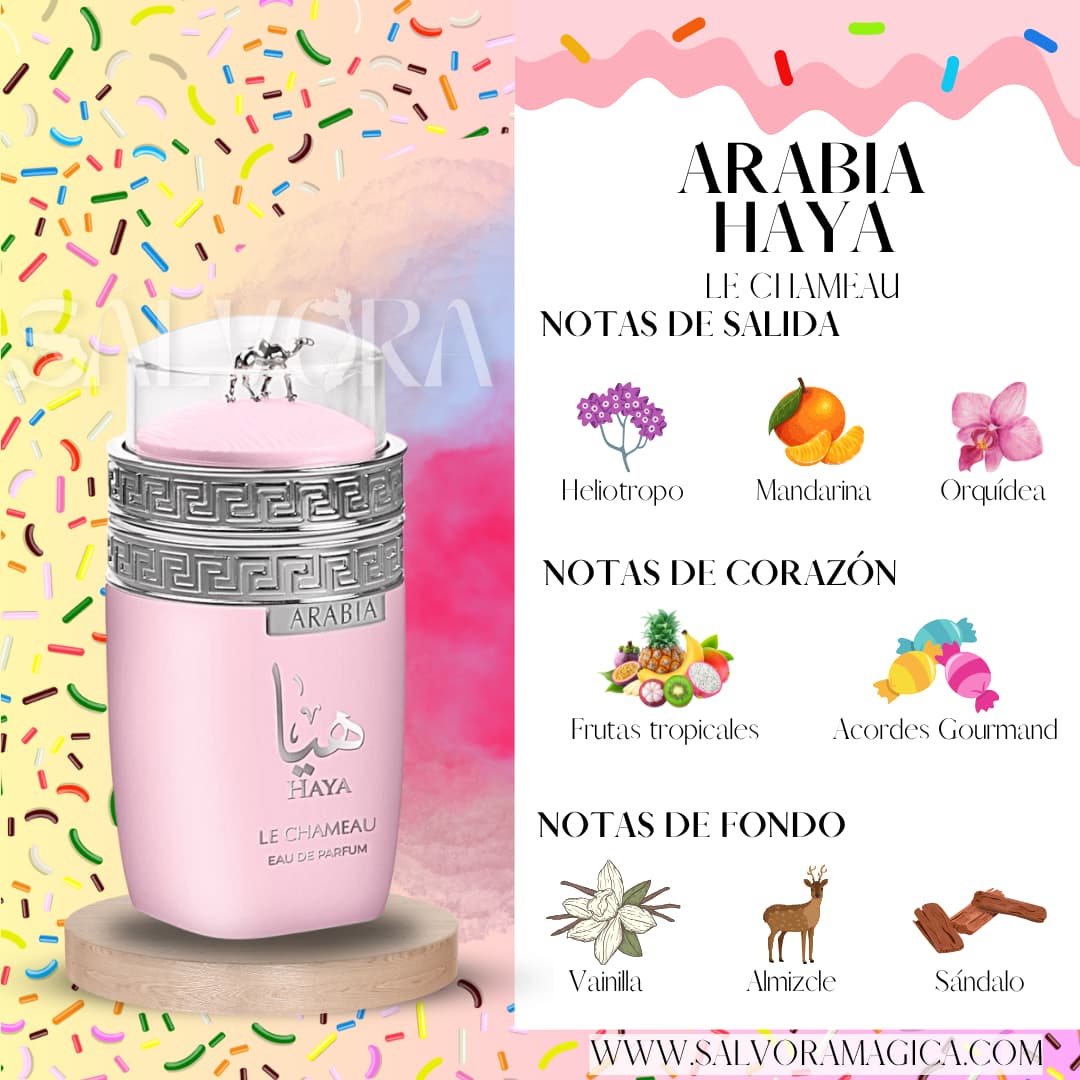 Arabia Haya de Le Chameau es una fragancia femenina que combina frescura, dulzura y sofisticaci贸n en una composici贸n floral y gourmand. Ideal para mujeres que buscan un aroma envolvente y elegante, esta fragancia ofrece una experiencia olfativa encantadora.
