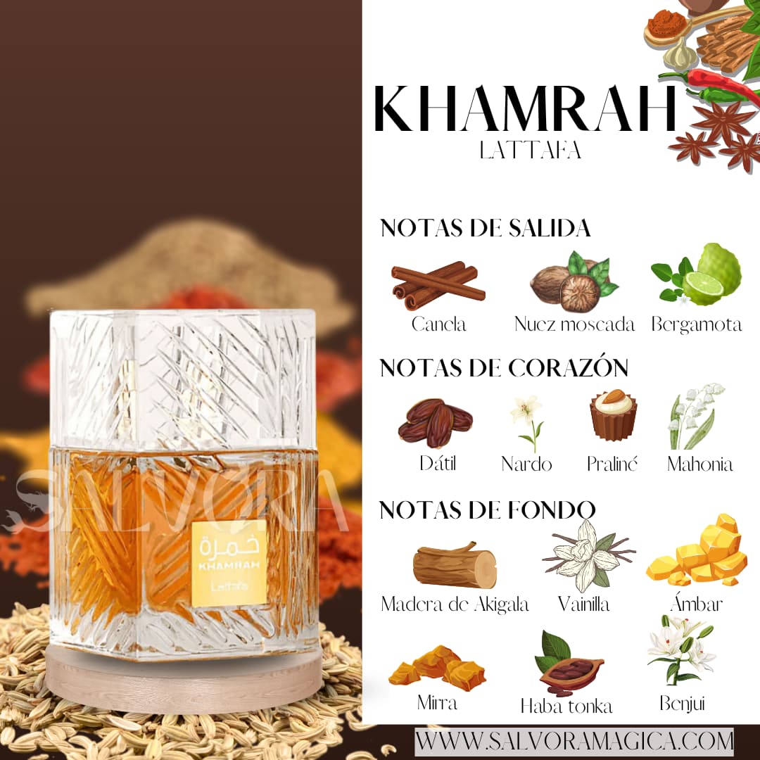 Khamrah de Lattafa Perfumes es una fragancia unisex de la familia olfativa especiada aromática, lanzada en 2022. Destaca por su carácter cálido, dulce y envolvente, ideal para quienes buscan un aroma sofisticado y duradero.