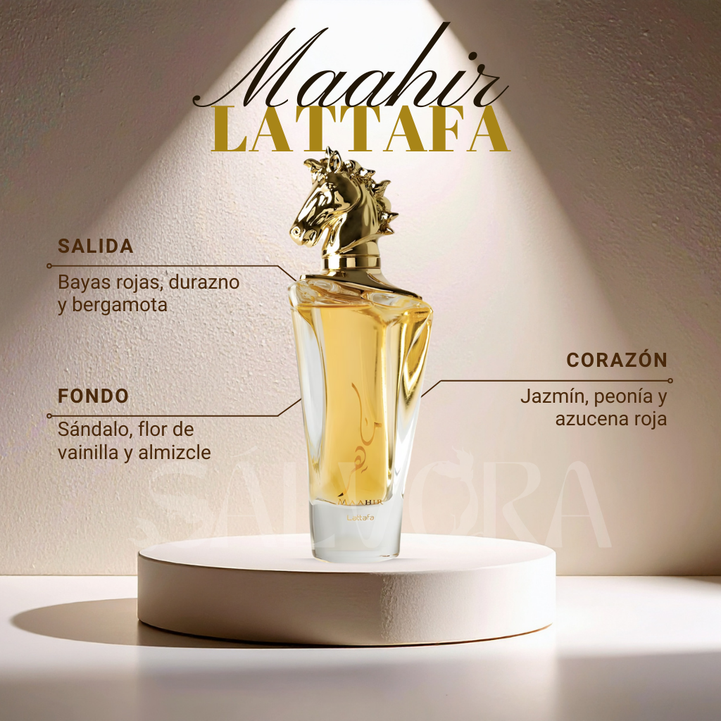 Maahir de Lattafa es una fragancia masculina que combina frescura afrutada 🍑, elegancia floral equilibrada 🌿 y un fondo cálido y sensual ✨. Su composición ofrece una experiencia olfativa sofisticada, moderna y con carácter, pensada para el hombre que busca destacar con distinción.